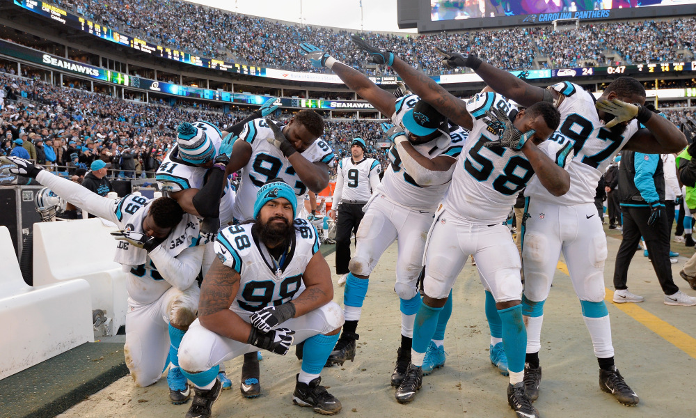 CHARLOTTE, NC – JANUARY 17: Carolina Panther teammates do “the dab” during the finals seconds of the NFC Divisional Playoff Game at Bank of America Stadium on January 17, 2016 in Charlotte, North Carolina. The Carolina Panthers defeated the Seattle Seahawks 31-24. (Photo by Grant Halverson/Getty Images)